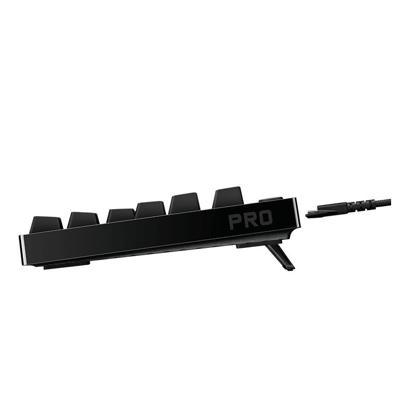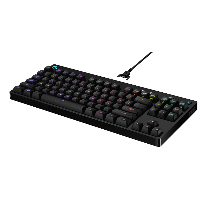 The Pro by Logitech is a TenKeyLess keyboard with 87 keys, which uses ROMER-G switches. The Pro keyboard uses a USB connection, with a 1.8 m cable. It is supported by Logitech Gaming Software software. And has 16.8M per key lighting backlighting. It weighs in at 980g w/o cable, and is 360 x 153 x 34.3 mm [LxWxH].