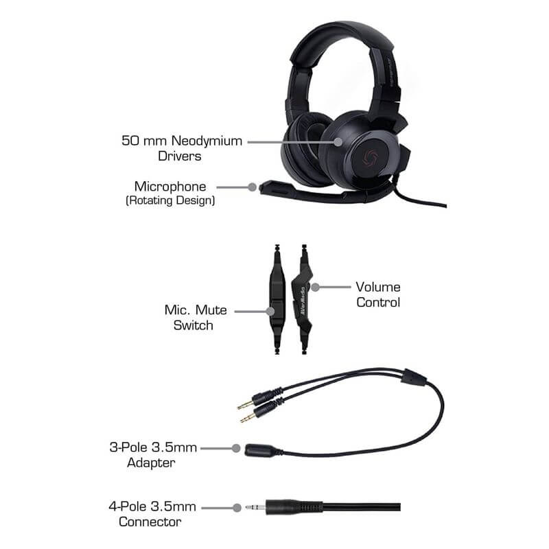 The SonicWave GH335 by AVerMedia, which uses a 50 mm, Neodymium driver. It uses a 4-pole 3.5 mm, 3.5 mm splitter connection with a 2.2 m, braided cable. This delivers a frequency response of 20 - 20,000 Hz and a sensitivity of 97 +/- 3dB. It also has an Omnidirectional microphone and a sensitivity of -38 +/- 3dB. And only weighs in at 340 g.