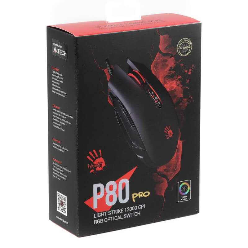 The P80 Pro by Bloody uses an Optical sensor. This results in a tracking speed of 75 inches/sec, and a maximum acceleration of 30 g. It uses a USB connection with a 1.8m Braided cable.