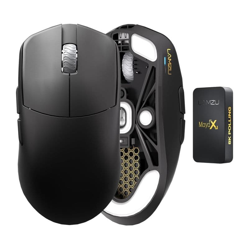 The Lamzu MAYA X 8K is a versatile gaming mouse designed for competitive esports with advanced 8000Hz polling rate technology and ambidextrous flexibility. Powered by the PixArt 3950 optical sensor with up to 30,000 DPI and Nordic 52840 processor, it delivers professional-grade precision and responsiveness for high-level competitive gaming. This lightweight 47g mouse features a symmetrical design suitable for both right-handed and ambidextrous use, with 6 programmable buttons equipped with premium Omron optical switches and smooth PTFE feet for consistent performance. Offering dual connectivity via wireless and wired connection through a 1.8m USB-C paracord cable, it provides impressive battery life of up to 80 hours at 1000Hz or 20 hours at maximum 8000Hz performance with lithium-ion rechargeable battery. Compatible with Windows and Mac systems, this larger-profile mouse (124 x 64 x 40mm) focuses on competitive performance without RGB lighting, designed to accommodate various grip styles while maintaining professional esports standards.