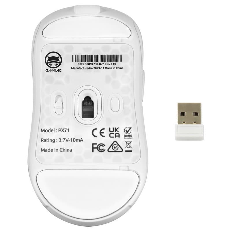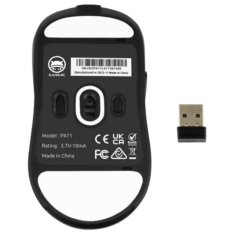 The Gamiac PX71 is a lightweight, all‑black or white wired‑wireless gaming mouse that feels surprisingly flexible. With six programmable buttons, a symmetrical right‑handed grip, and a Huano‑swappable switch, it lets you swap out clicks on the fly. A whopping 180 cm Type‑A‑to‑Type‑C cable keeps you tethered or wireless on a clean 2.4 GHz link. Inside, a PixArt PMW3335 sensor offers DPI options from 800 up to 16,000, and the polling rate is tunable from 125 Hz to 1,000 Hz. The mouse sports a 16.8 M‑color RGB RGB LED and ten lighting modes that match your gaming vibe.